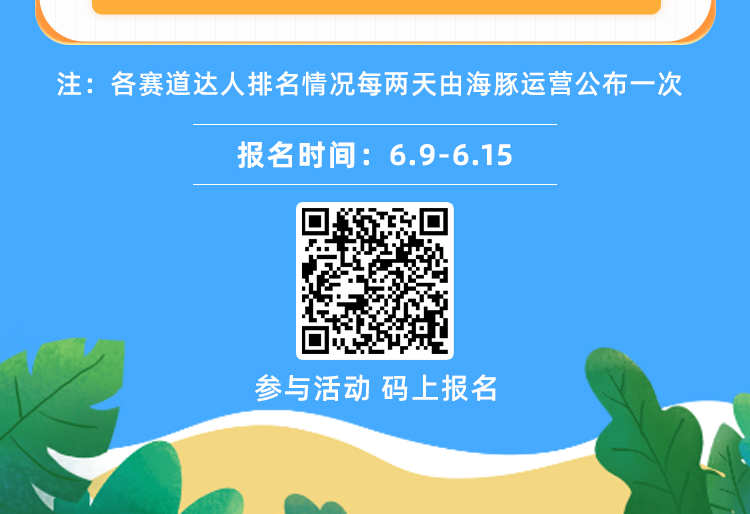 本次活动将于6月9日正式开始报名,活动报名开始后将在公众号菜单栏同步上线618活动报名入口,同时还会发送公众号消息提醒,请达人持续关注海豚知道公众号通知~