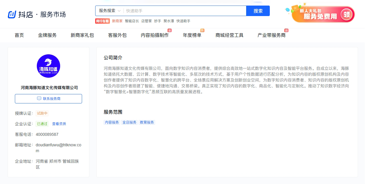 经过多年的发展并在市场力量的推动下,海豚知道凭借其卓越的服务能力和深厚的技术积淀,在知识服务领域得到了业界的广泛认可,先后获得了抖店教育培训服务商、小红书官方供应商、视频号官方服务商、快手官方服务商等多项资质。这些资质不仅证明了海豚知道在行业内的专业地位,也为其提供了更为广阔的发展空间和合作机会。