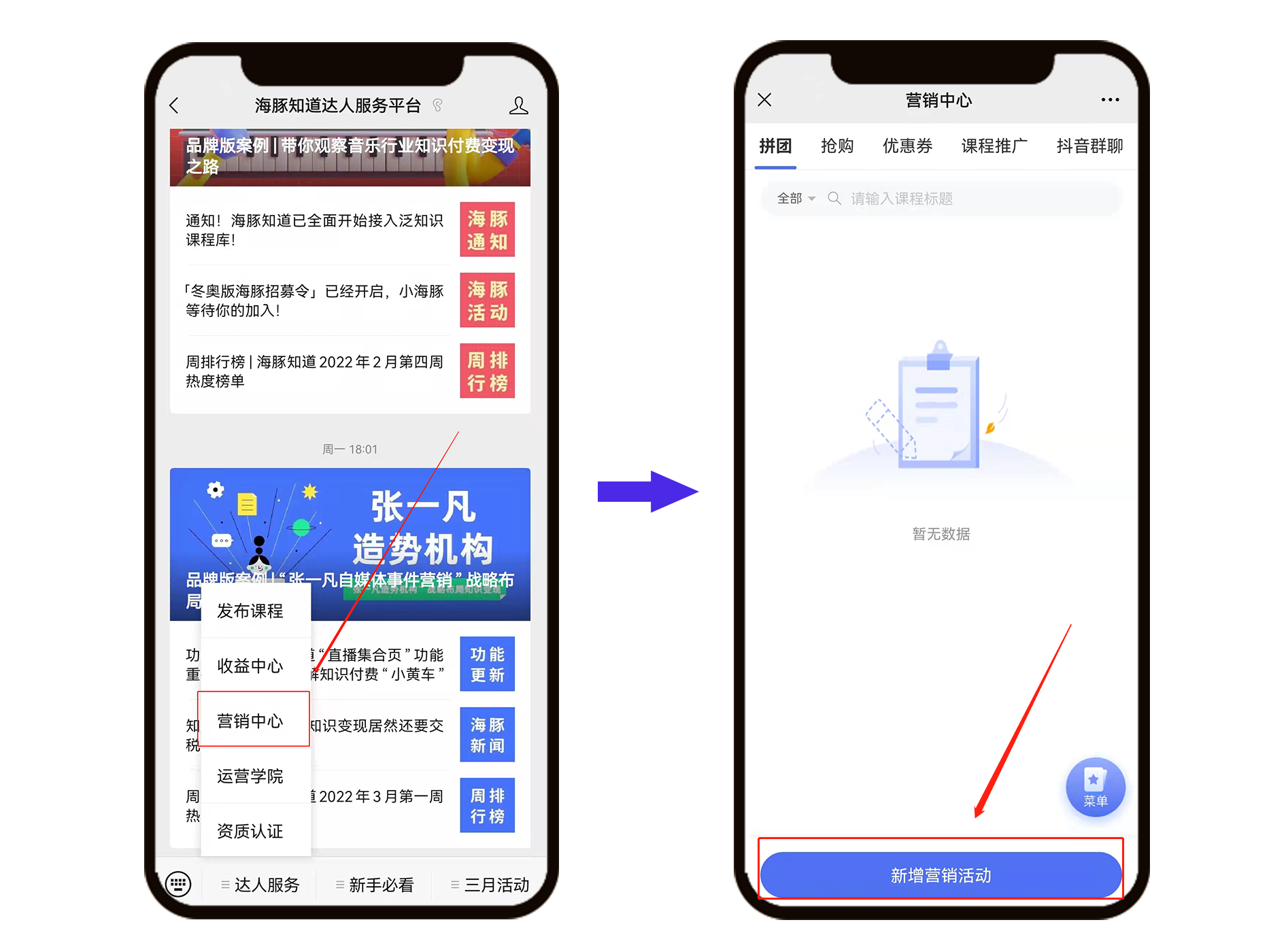 打开【海豚知道达人服务平台】公众号 → 点击菜单栏【达人服务】→ 点击【营销中心】→ 进入【营销中心】页面;