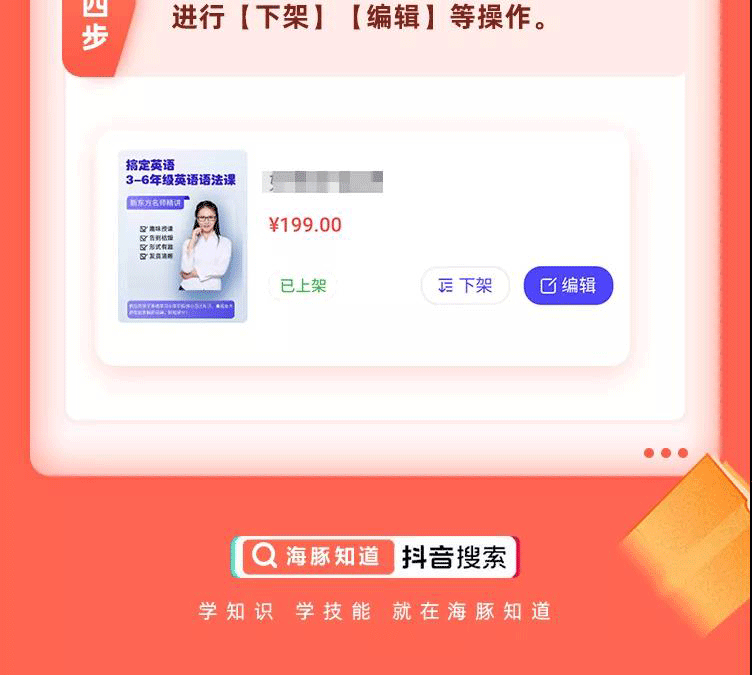 已上架课程:进入海豚知道后台 → 进入单课/专栏页面 → 选择需要的课程 → 点击“编辑” → 点击“开启”跑马灯 → 勾选“抖音id展示”/“版权声明”
