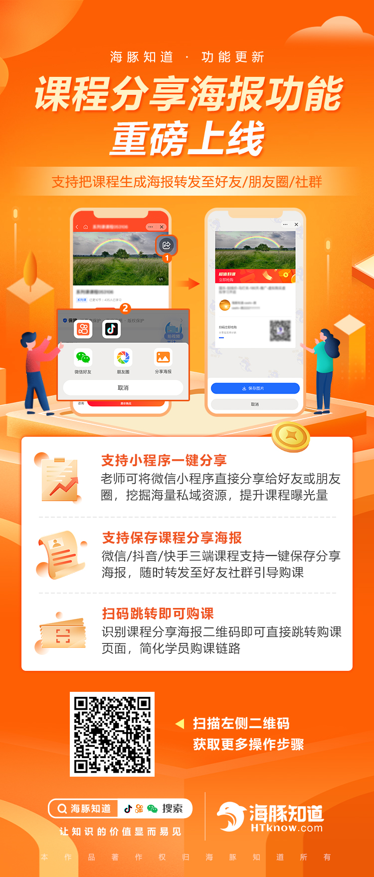 为助力老师多渠道实现课程转化,海豚知道特别上线了【小程序/课程主页分享】功能。