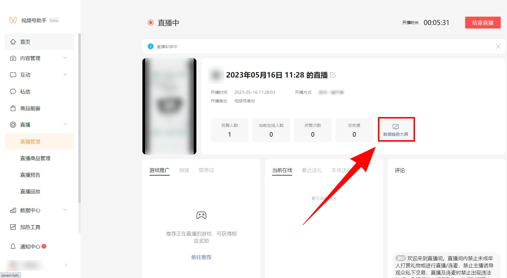 ②选择直播→点击【直播管理】→点击【数据趋势大屏】;