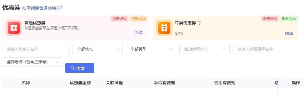 优惠券功能支持老师自定义金额、使用条件、有效期等,灵活设置多样化的营销活动。无论是普通优惠券还是专属优惠券,都能满足老师的需求。老师还可以选择批量发放或定向推送,让优惠券精准触达目标学员。