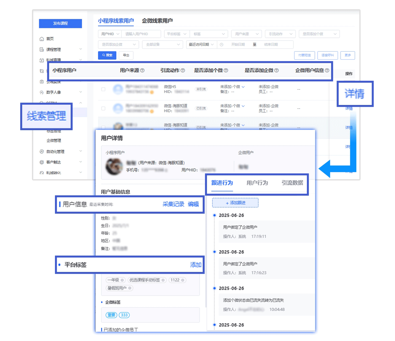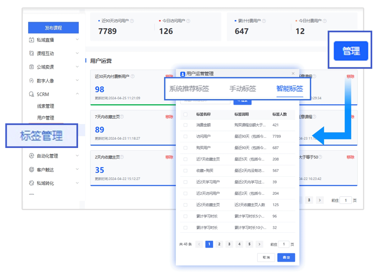 SCRM系统是每个私域运营老师既强大又贴心的助手。它能自动捕捉用户在一定范围内的动作,像浏览课程详情页的时长、进出老师直播间的频次、购买课程的时间点等,都逃不过它的眼睛。